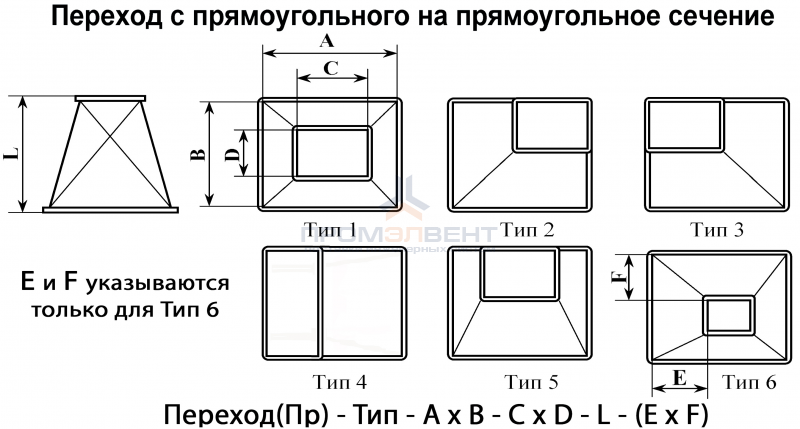 Переходы с прямоугольного сечения на прямоугольное сечение для систем дымоудаления предназначены для плавного перехода системы с одного прямоугольного сечения на другое сечение.